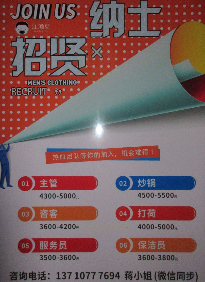 广大商中A区中横座二楼-江渔儿 招聘:主管4300-5000元,炒锅4500-5500元,咨客3600-4200元,打荷4000-5000元,服务员3500-3600元,保洁员3600-3800元 咨询电话13710777694蒋小姐(微信同步) |
