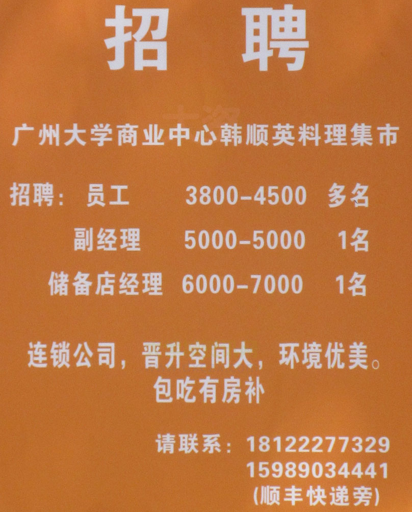 | 广大商中D区东南角 新店韩顺英料理集市 招聘员工多名3800-4500 副经理1名5000 储店经理1名6000-7000 联系电话18122277329 | ||||||
