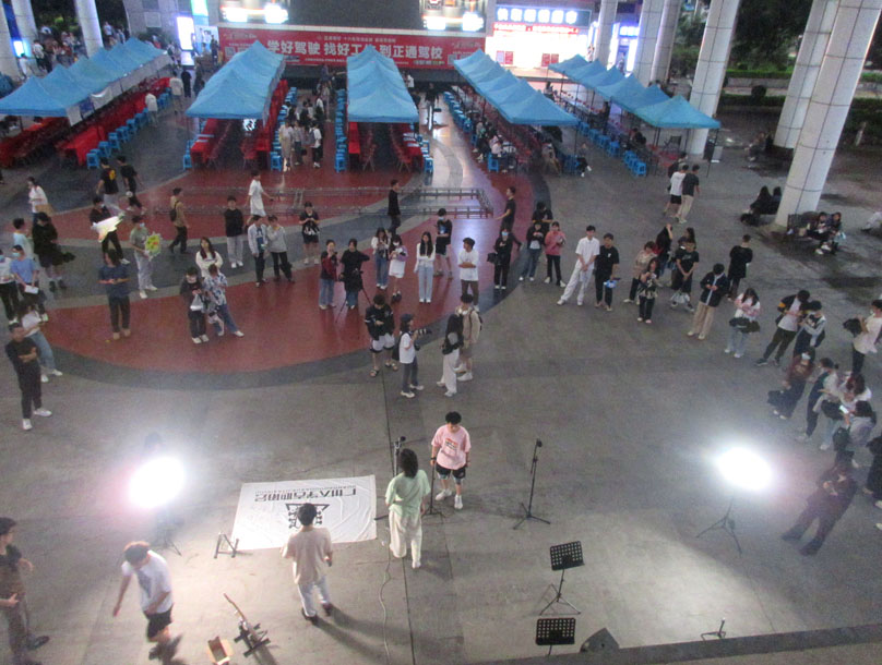 广州大学吉他协会的一个户外露天弹唱演出 正在商中中庭广场 准备开始 |