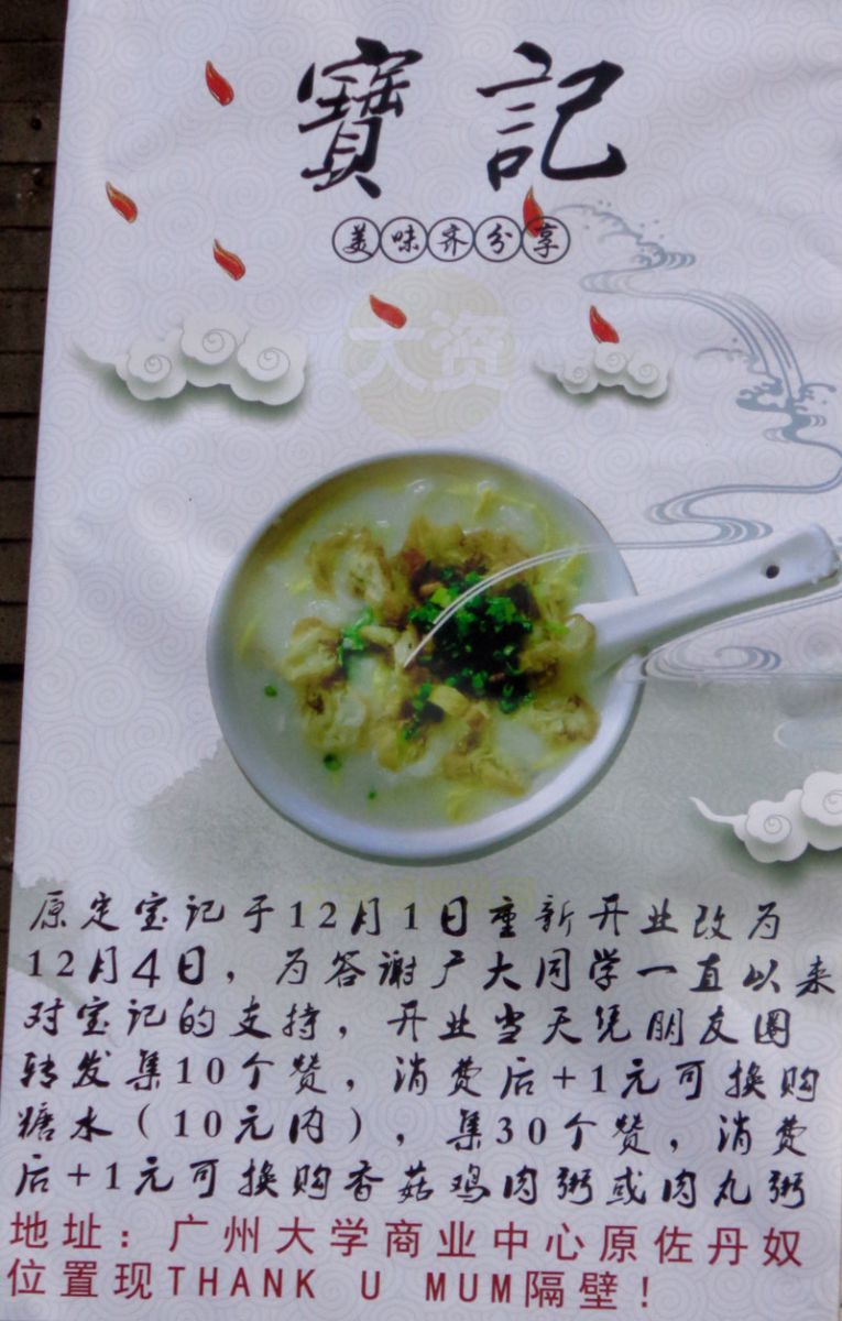 为答谢广大同学一直以来对宝记的支持,朋友圈集赞可换购香菇鸡肉粥or肉丸粥 地址:广州大学商业中心原佐丹奴位置现THANK U MUM隔壁! |