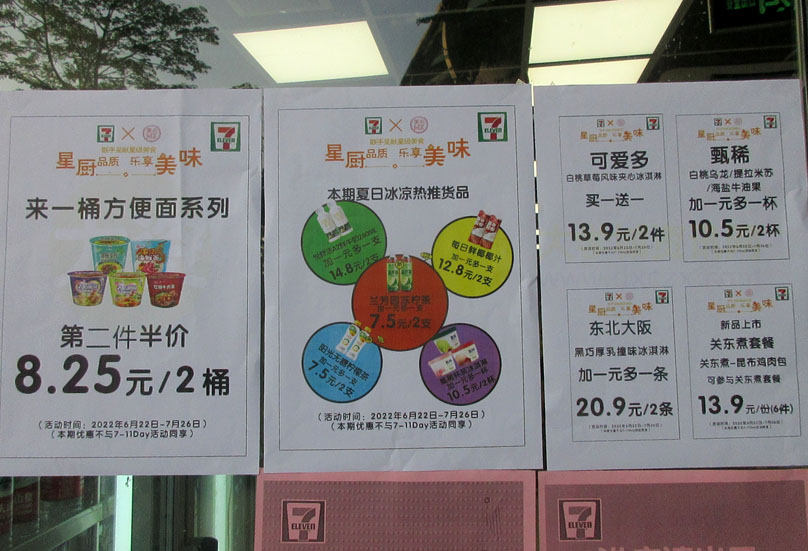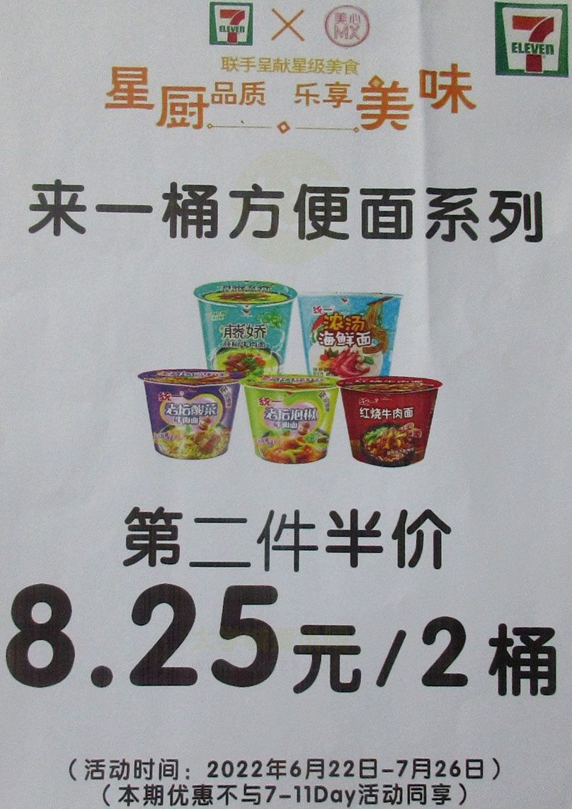 | 广大商中A区西门天桥下-711便利店 2022.06.22-07.26优惠:来一桶方便面第二件半价(8.25元2桶);本期夏日冰凉热推货品加一元多一支;还有其它…… | ||||||