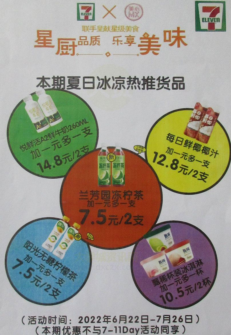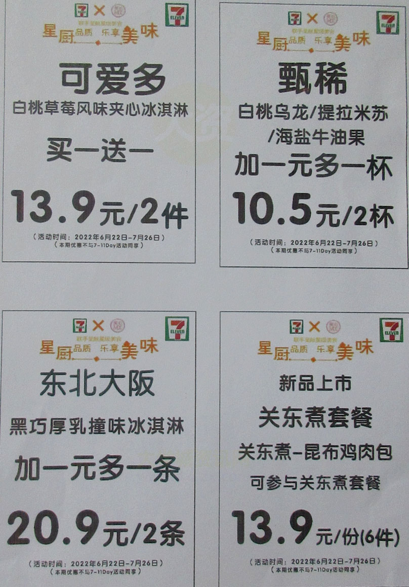 广大商中A区西门天桥下-711便利店 2022.06.22-07.26优惠:来一桶方便面第二件半价(8.25元2桶);本期夏日冰凉热推货品加一元多一支;还有其它加一元多一份&以及可爱多买一送一&关东煮新品昆布鸡肉包上市可参与套餐(1份6个13.9元)