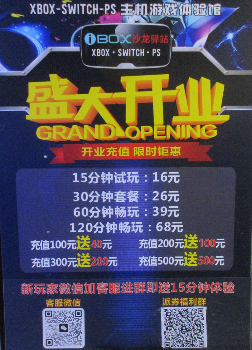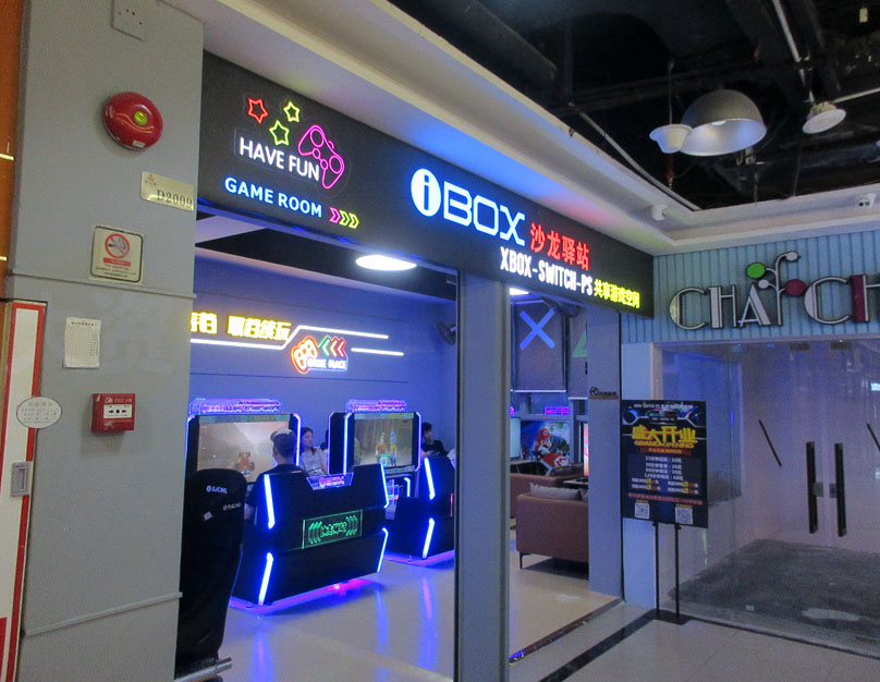 广大商中D区二楼西北角 看到也新开了一家游戏机室,名叫iBOX沙龙驿站,看前缀主要是玩XBOX-SWITCH-PS主机游戏体验,最近大学城内类似这种这样的主机游戏机室似乎有点兴起啊,新天地贝岗已开有两三家,广大商中这边也至少有两家了