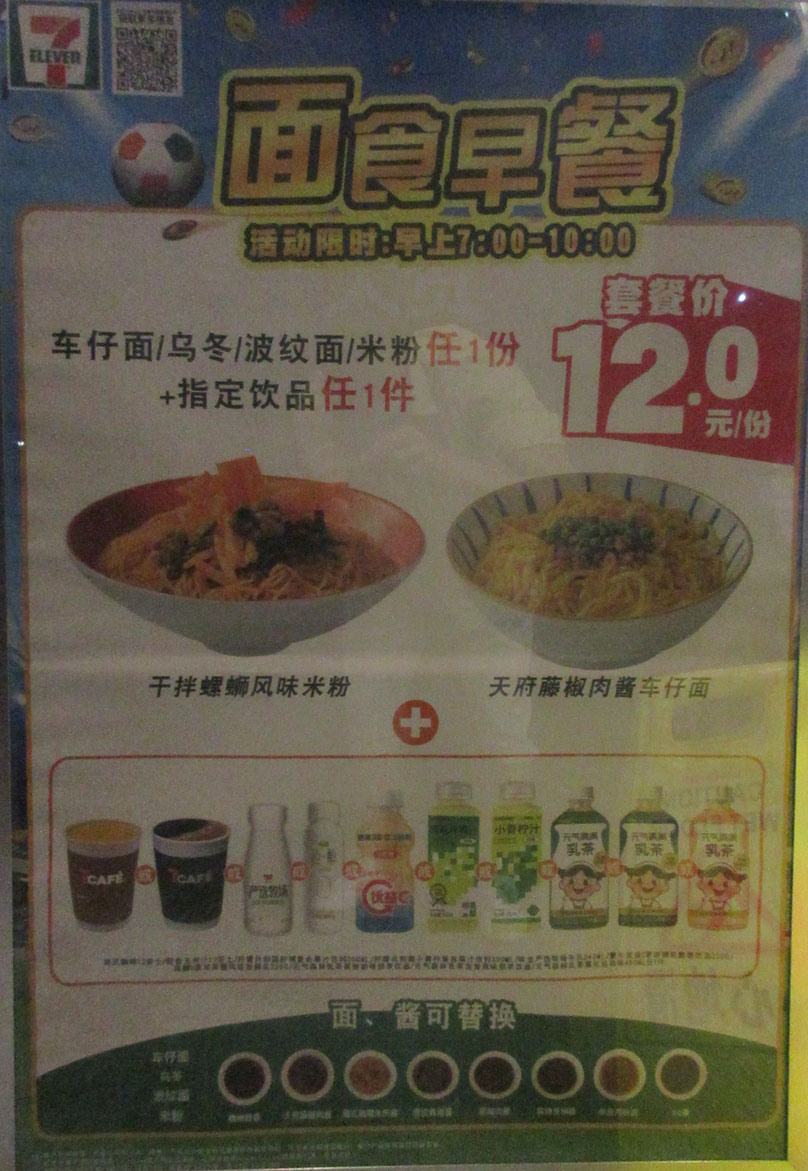 广大商中D区中横座东北角 711便利店 面食早餐-车仔面&乌冬&波纹面&米粉任1份+指定饮品任1件套餐价12元 只限早上7点到上午10点 活动期11.21-12.18