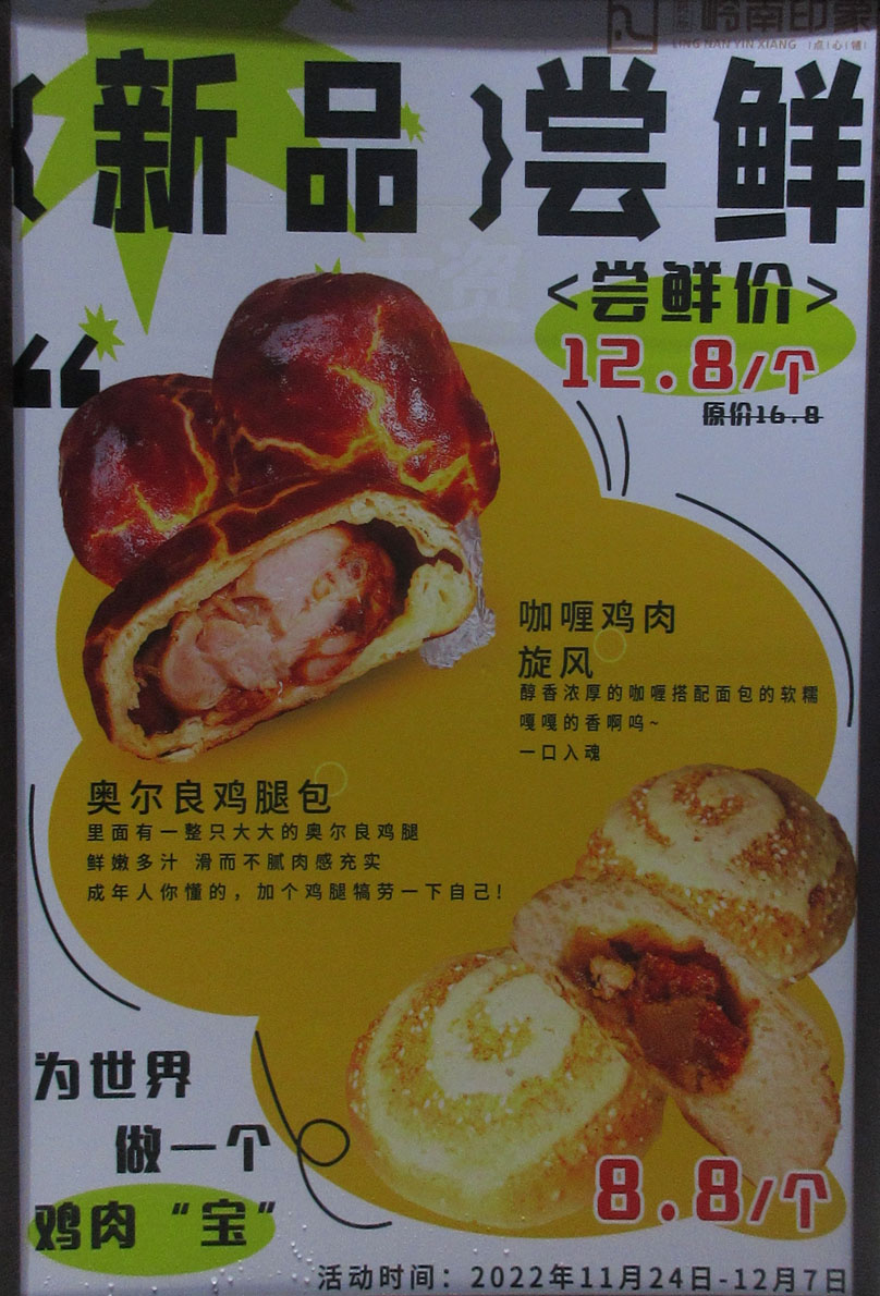 广大商中A区南横座东 岭南印象蛋糕店 新品尝鲜 奥尔良鸡腿包12.8元1个 咖喱鸡肉旋风8.8元1个 活动期2022.11.24-12.07