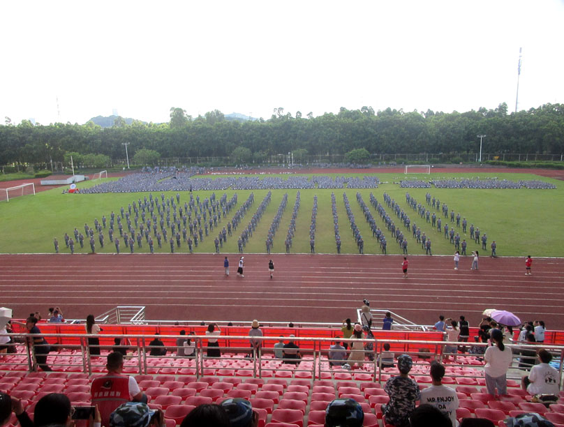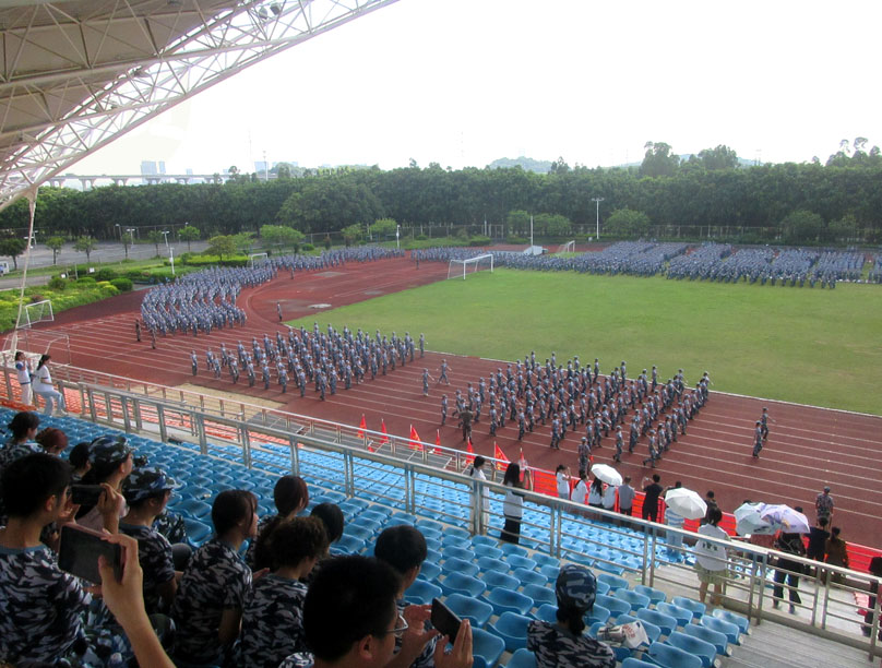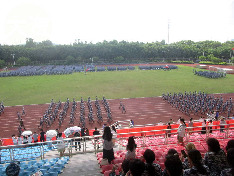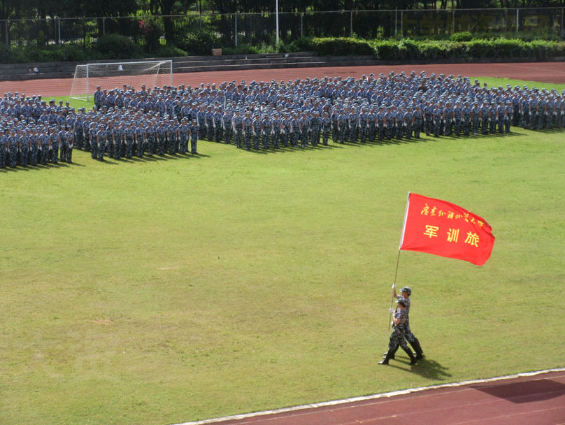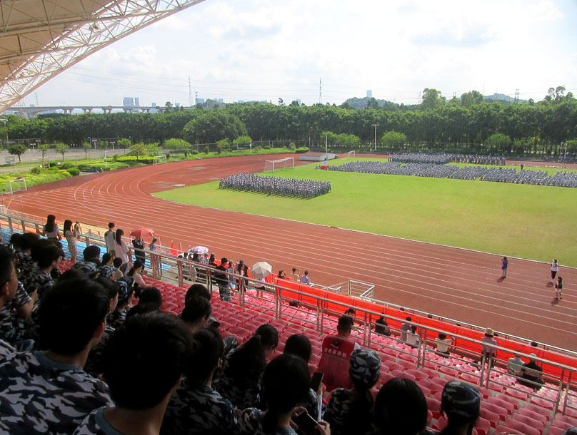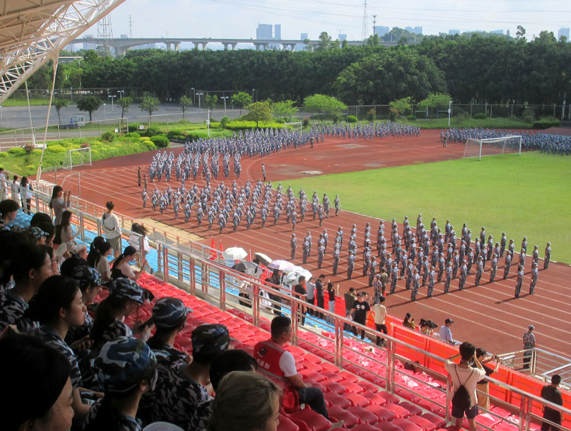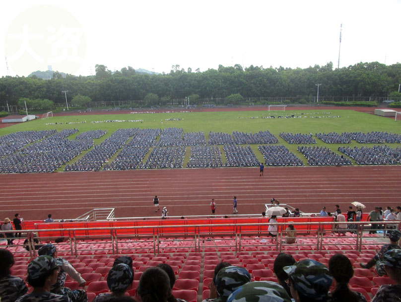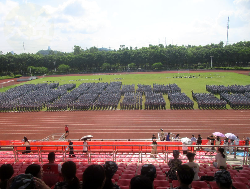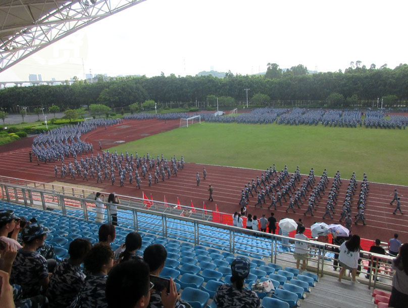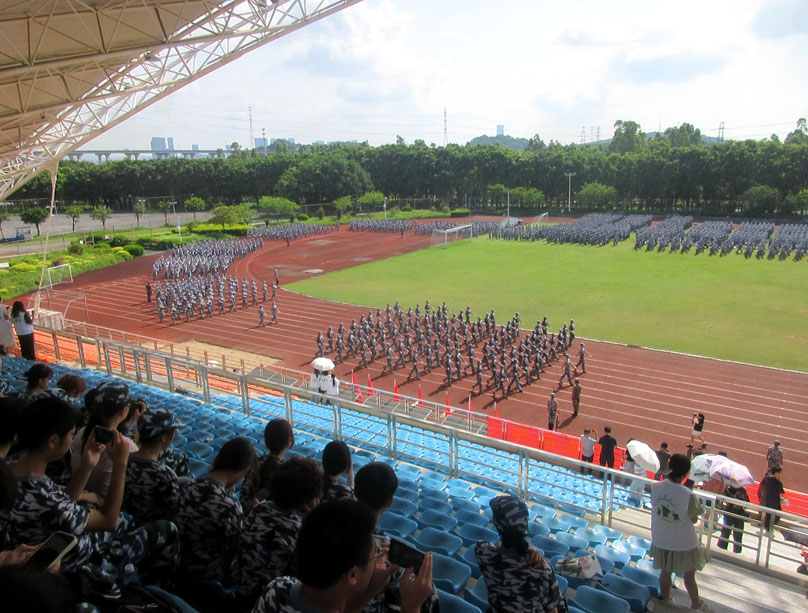 广东外语外贸大学2022级本科学生军训汇报表演暨总结表彰大会 今上午在教学区体育场进行 大约上午9时开始到10点过 现场太阳天气时多较为照晒 不管怎样大家这个为期两周的军训之旅也算完满结束 即将开启炎热酷暑的夏季暑假