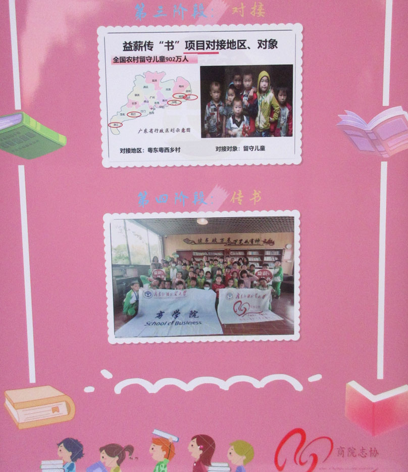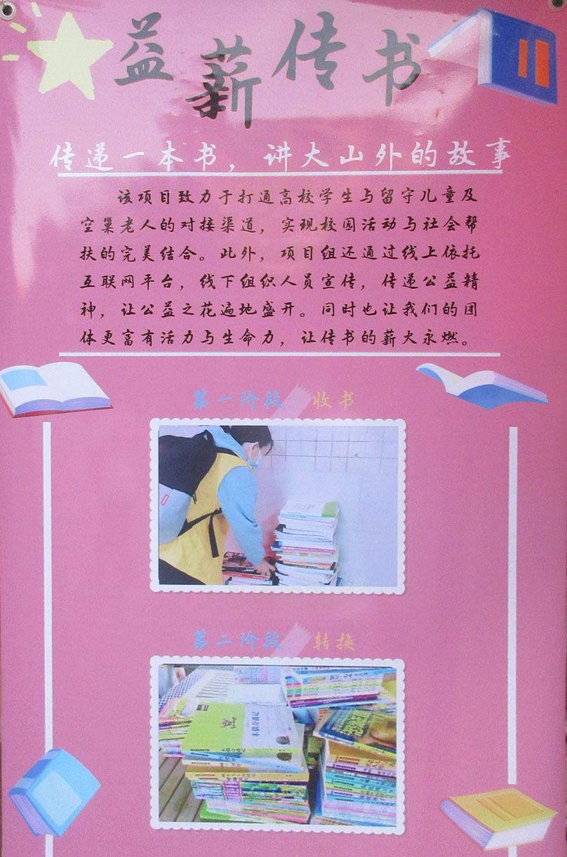 益薪传书-传递一本书,讲大山外的故事活动摊宣正在生活区主干道进行 第一阶段:收书,第二阶段:转换,第三阶段:对接,第四阶段:传书