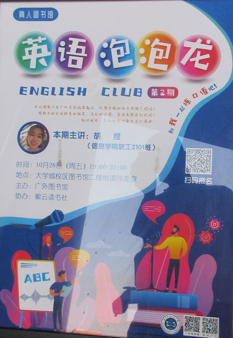 | 真人图书馆·英语泡泡龙第二期 本期主讲:胡煜(信息学院软工2101班) 时间:10月28日周五晚19点-21点 图书馆二楼悦读沙龙室 | ||||||