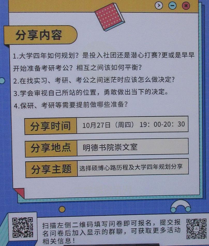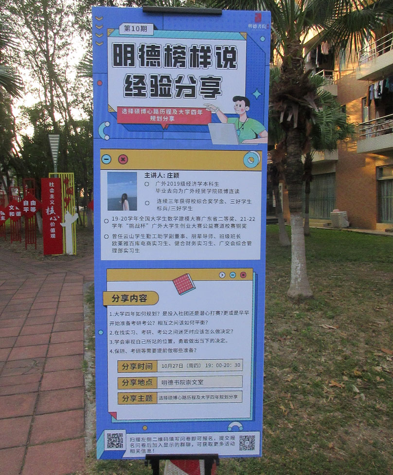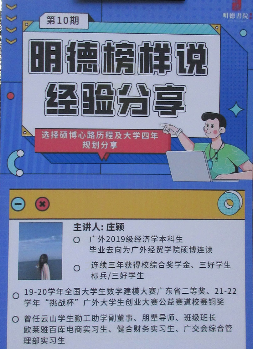 | 第10期明德榜样说经验分享 主题:选择硕博心路历程及大学四年规划分享 主讲人:庄颖-广外2019级经济学本科生 10月27日周四晚19点-20点30 生活区明德书院崇文室 | ||||||