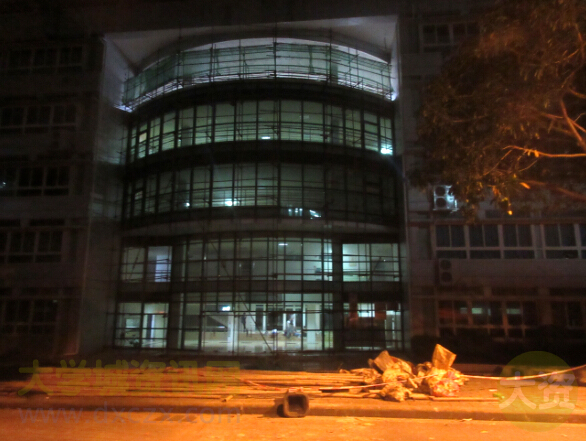 教学区基础楼正面玻璃外墙似乎在搭棚架准备装修翻新美化