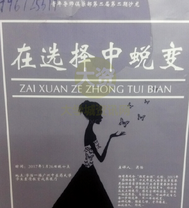 青年导师俱乐部第二届第二期沙龙:在选择中蜕变 主讲人:吴怡 时间:2017年5月26日晚七点 地点:学活一楼