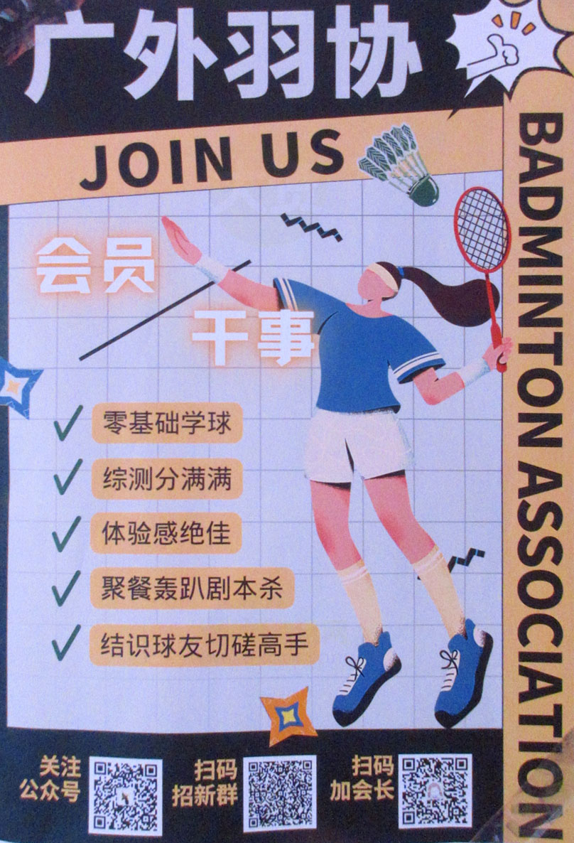 | 广外羽毛球协会2022会员&干事招新 零基础学球,综测分,聚餐轰趴剧本杀等 扫码加入招新群 | ||||||