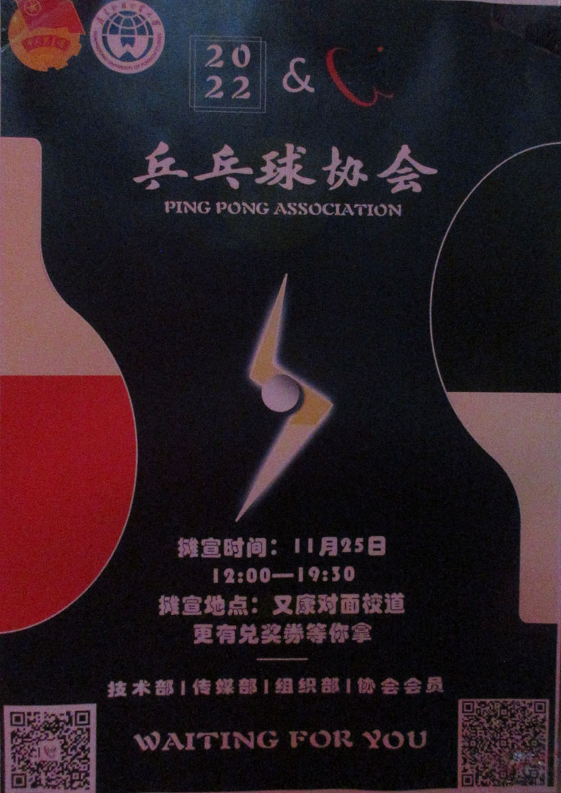 | 广外乒乓球协会2022招新 摊宣11月25日中午12点-晚上19点30 生活区主校道又康超市对面 有兑奖券拿 | ||||||