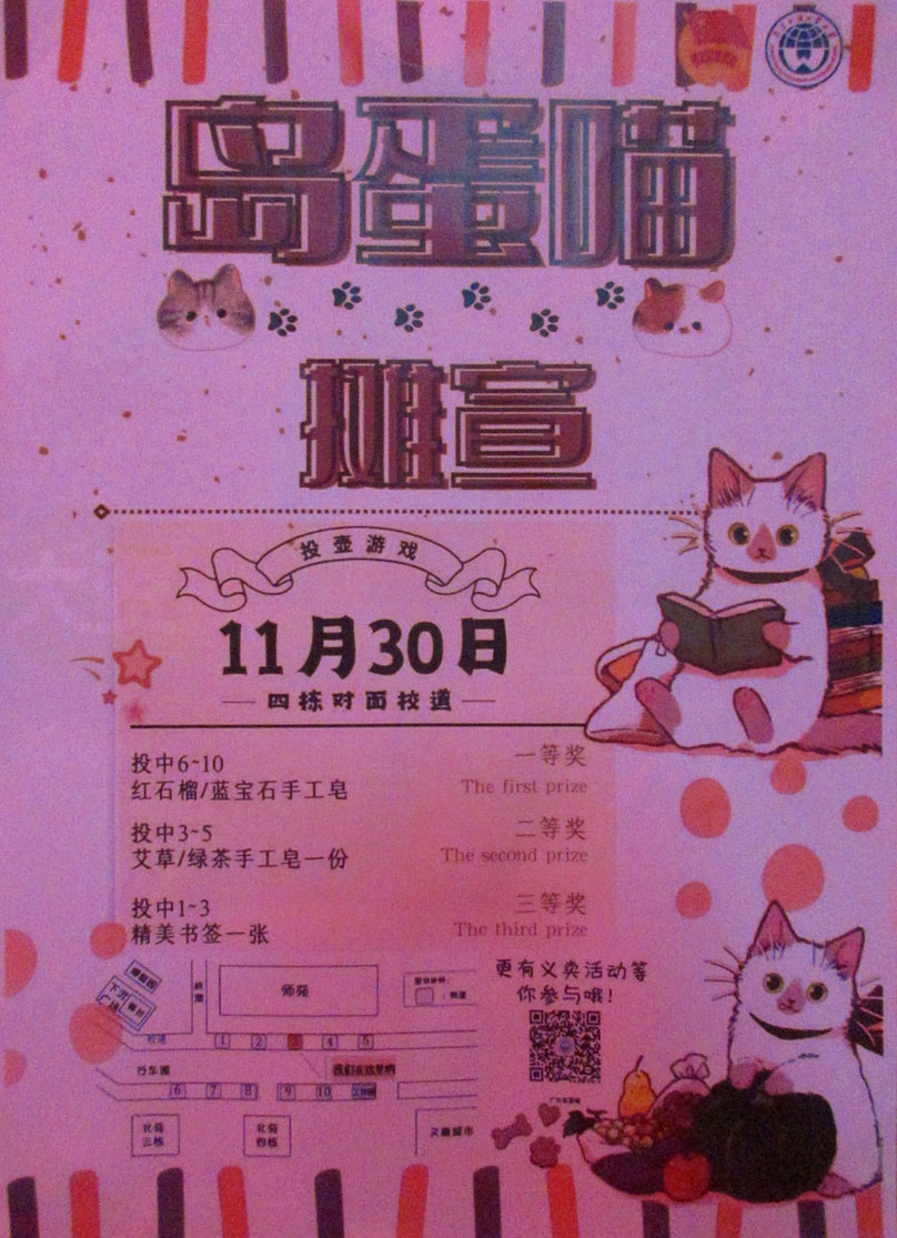 广外动物保护协会-岛蛋喵投壶游戏摊宣 11月30日 生活区主校道北苑4栋对出 奖品实用精美 同时还有义卖活动 |