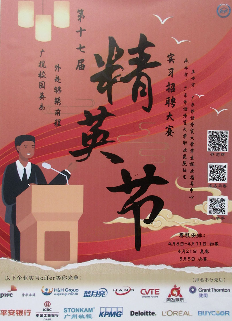 | 广外 第十七届精英节实习招聘大赛 赛程安排:4月8日-4月11日初赛 4月21日复赛 5月5日决赛 | ||||||