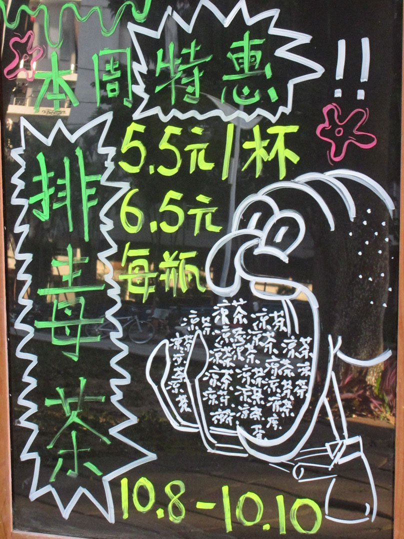 广外生活区南11栋西北角临校道 云山凉茶坊 本周特惠排毒茶 5.5元1杯 6.5元1瓶 时间10.8-10.10