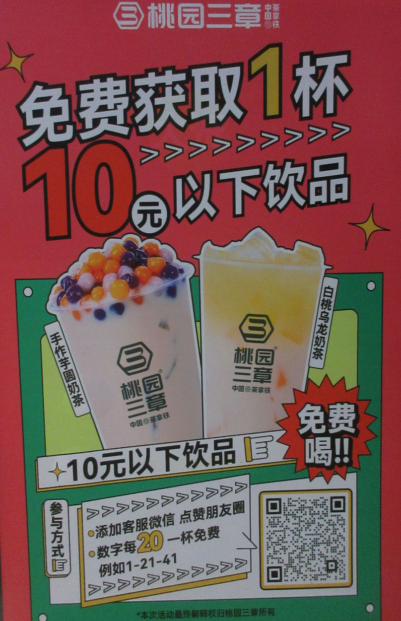 | 广外三饭风采园一楼入口北侧 桃园三章 朋友圈集赞免费获饮 双十一狂欢购 小程序下单第二杯半价 | ||||||
