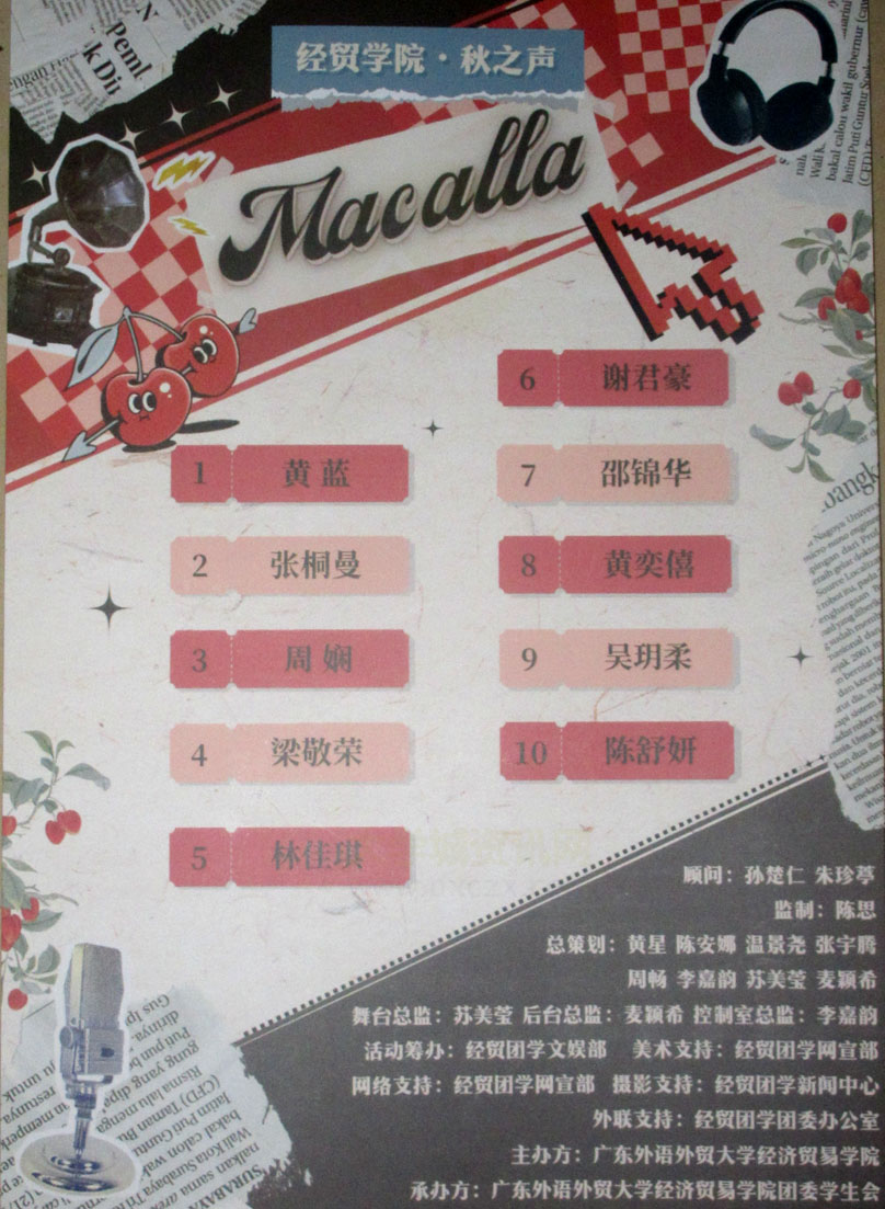 | 广外-经济贸易学院第二十九届Macalla秋之声歌唱比赛决赛今晚在生活区学活-多功能活动厅进行 789号顺位出场选手恰分获最终前三名&冠亚季军 邵锦华 黄奕僖 吴玥柔 | ||||||