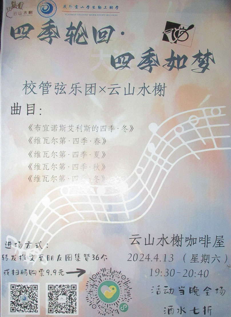 | 广外-校管弦乐团&云山水榭 曲目演出预告 2024.04.13周六晚19点30-20点40 生活区北六栋-云山水榭咖啡屋 | ||||||