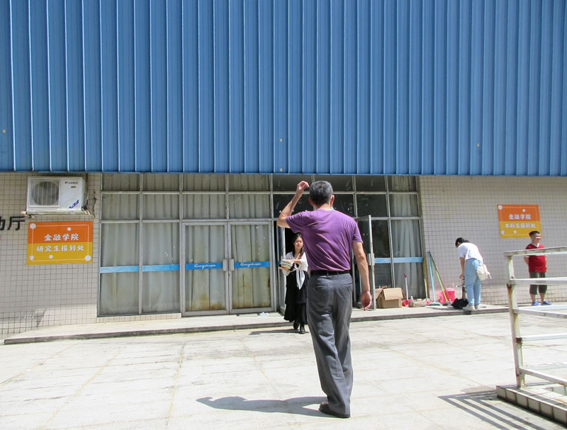 金融学院的报到点设在多功能活动厅 空间又大、空调又明显 让人感到舒适