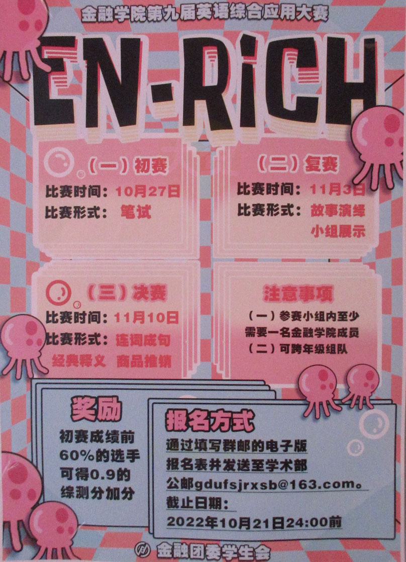 | 广外金融学院第九届英语综合应用大赛 初赛10月27日笔试 复赛11月3日故事演绎&小组展示 决赛11月10日连词成句,经典释义,商品推销 奖励-初赛成绩前60%可获0.9综测分 报名方式详见 | ||||||
