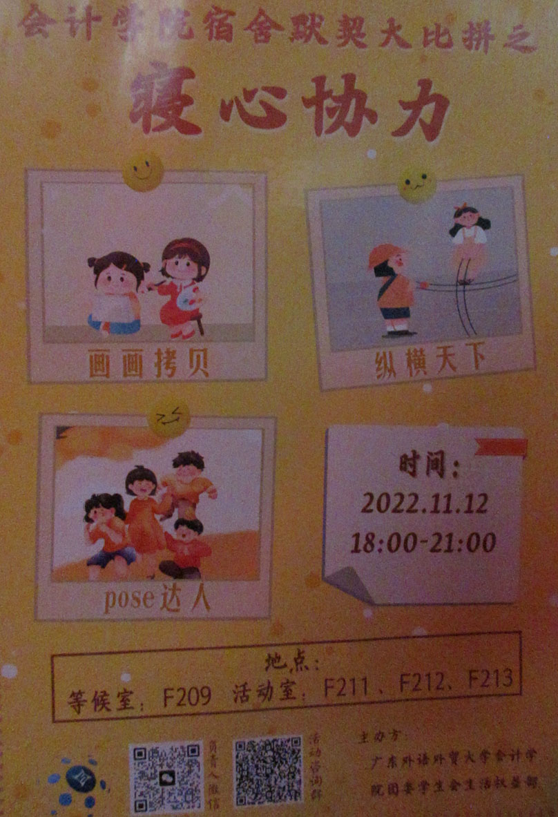 | 会计学院宿舍默契大比拼之寝心协力 2022.11.12周六晚18点-21点 教学区F211,F212,F213 扫码进活动咨询群 | ||||||
