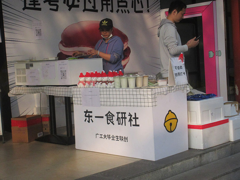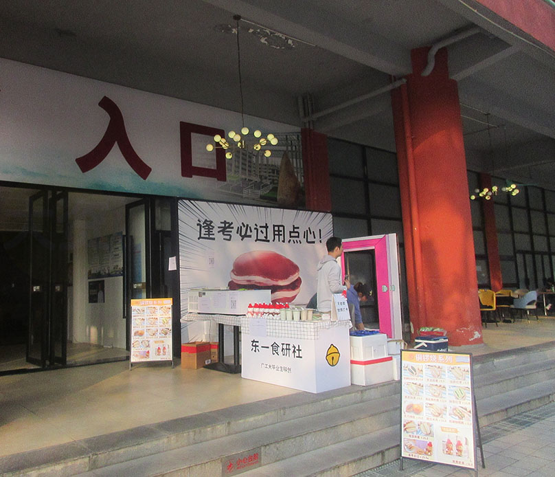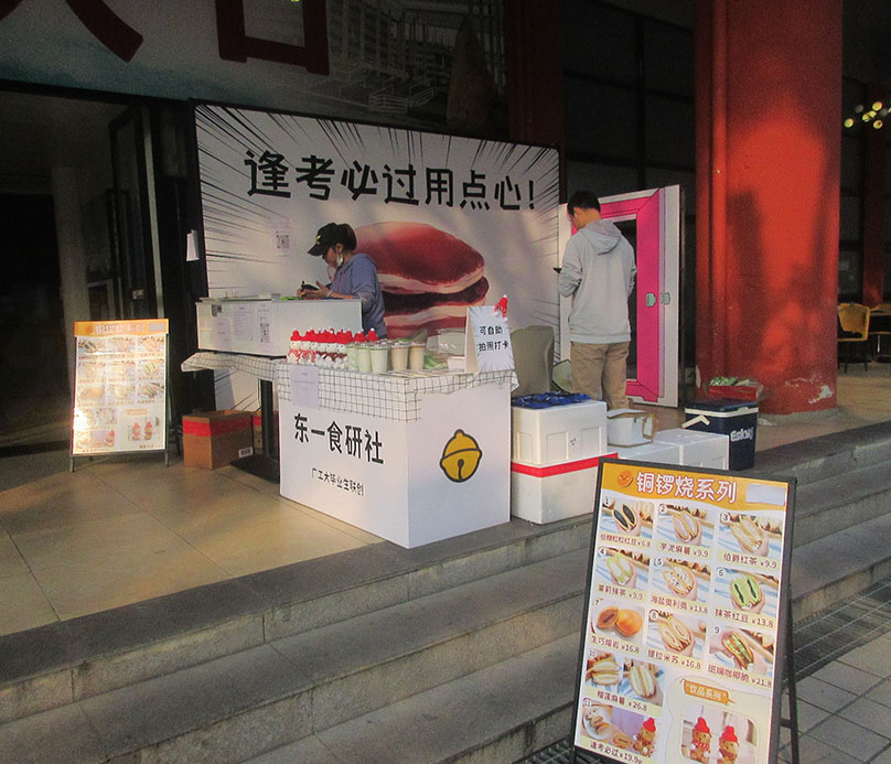 这东区一饭西南角出入口外 是临时开摆了个卖早餐或点心之类的创意摊吗 叫东一食研社 背景主题是呼应期末考试