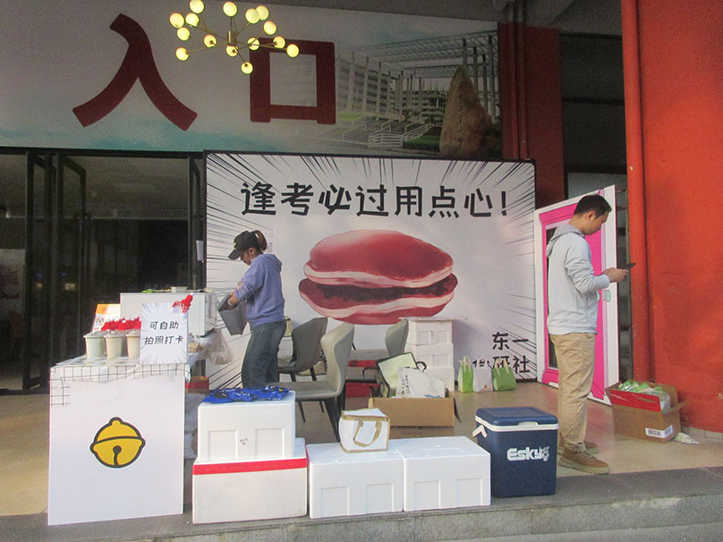 | 这东区一饭西南角出入口外 是临时开摆了个卖早餐或点心之类的创意摊吗 叫东一食研社 背景主题是呼应期末考试 | ||||||