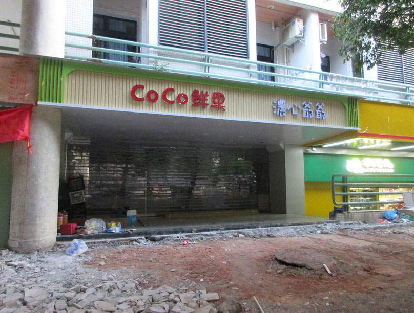 西区六栋北座一楼临街铺位新装 中间铺位看着也已基本装好 其中零食店装好并正在开试营业 上次已见的水果店似乎旁侧还开一家叫濃心爺爺的面包店,东北角的听说是做奶茶店看到还是没怎么有开始正式装修,另外这列西端之前看到还在开的阿里之门超市也已经在进行拆装修,早之前就装好并复业的粤安驾校和打印店已经放假没开