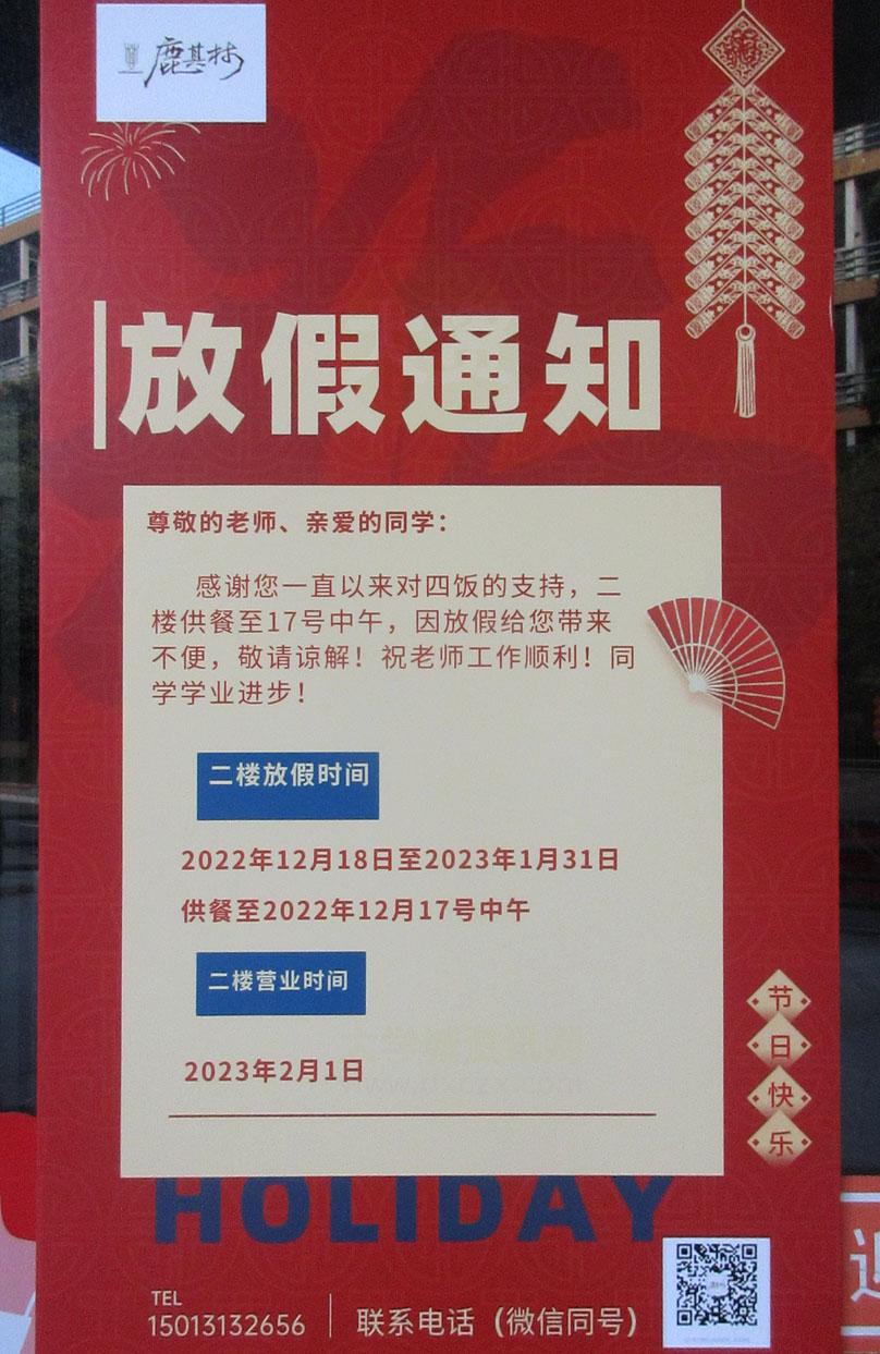 | 广工西区四饭二楼放假通知 2022年12月18日至2023年1月31日放假,供餐至2022年12月17号中午 恢复营业时间为2023年2月1日 | ||||||