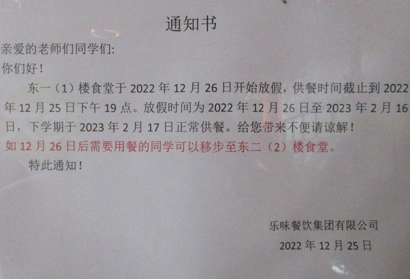 | 东区一饭一楼12月26日开始放假,至明年2月16日,2月17日恢复正常供餐 本学期寒假期间,东区二饭二楼有开 | ||||||