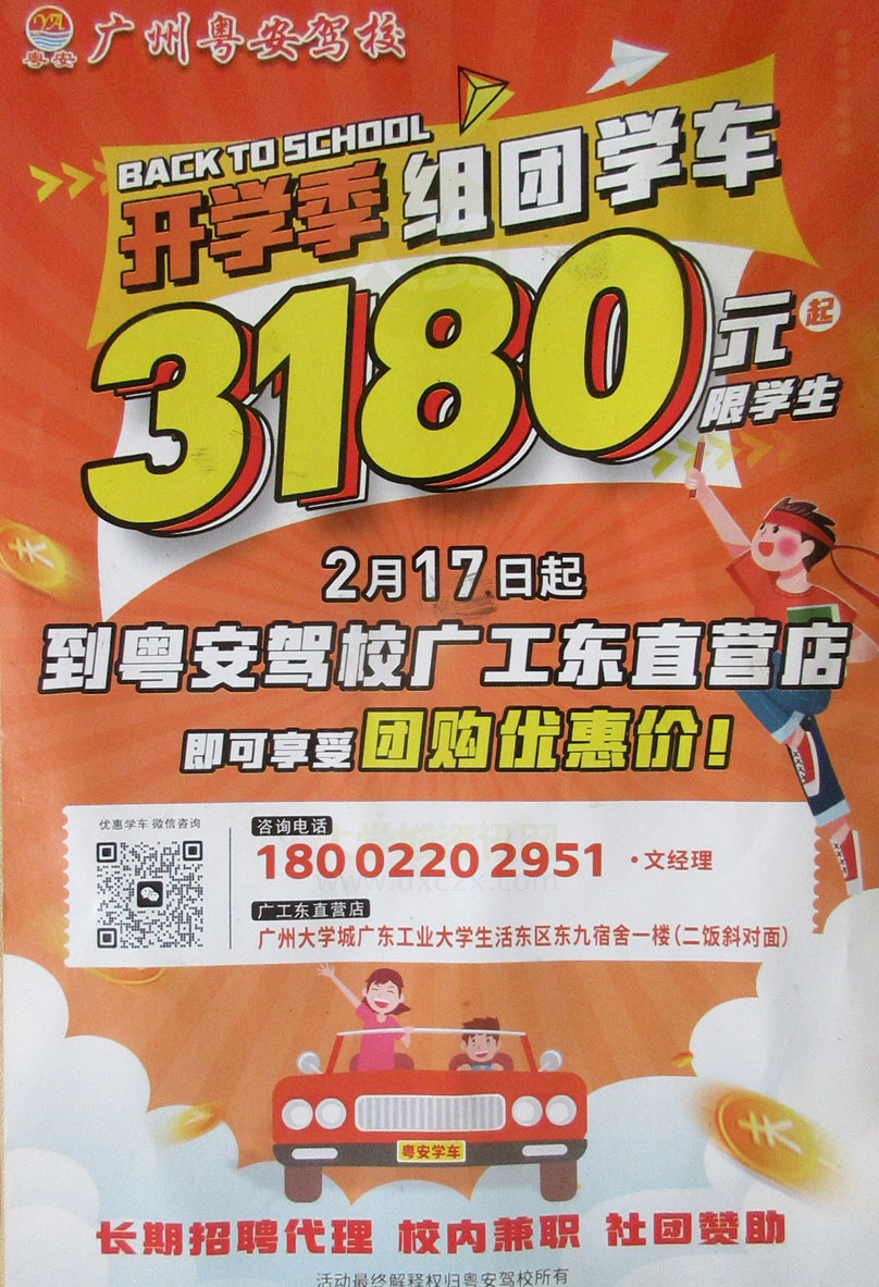 粤安驾校开学季 组团学车 3180元起 限学生 2月17日起到广工东直营店,即可享受团购优惠价
