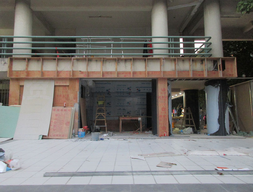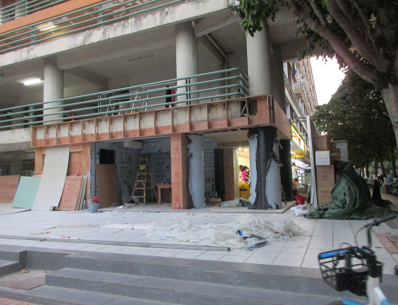 广工西区六栋东北角 当初说是可能做茶饮店的看着是不是装修比较有进展了 不过最新实际看到是不是有几分像华工广美开的F5未来商店&自助购买食用,但这里店面空间还是更小 这个东北角装修也是西六栋商铺门店本轮装修改造升级的最后一环了,因为其它店位早已装好也纷纷营业有时