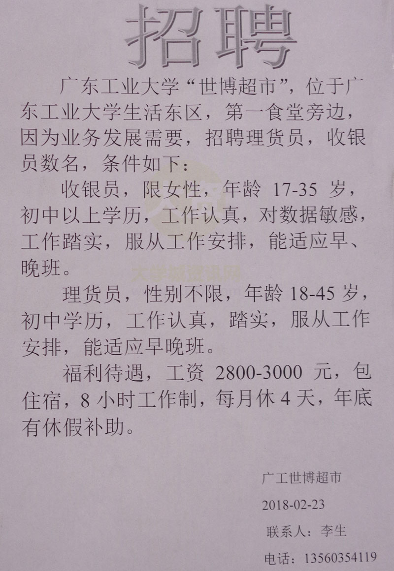 | 广工东区世博超市招聘理货员、收银员数名 13560354119李生 | ||||||