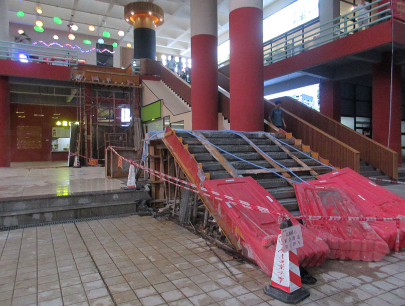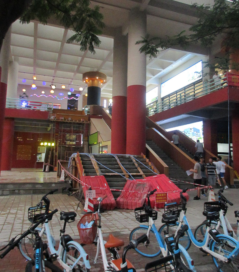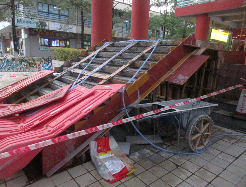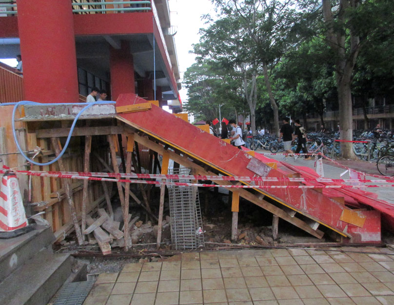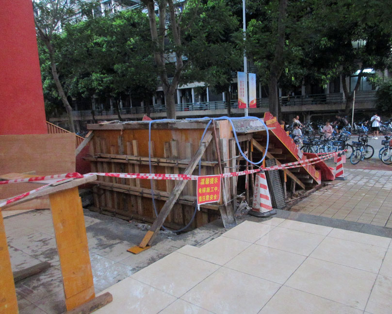 东区一饭西南角二楼的电梯看到真的在重新安装建设了,不过看着怎么跟之前的结合形式高低位势似乎没多大差别或者说改善优化,原本以为它重新建装后会应该是上电梯的平台直接与地面吻合或接近,可是看目前它搭建浇筑的这个基座或者说起步楼梯简直就跟之前的铁皮支架阶梯没什么两样啊,那它拆了又装的意义在哪,之前也看到了接地位是有挖一个基坑的,可是看现成这样似乎不是用来延伸电梯至地面而需