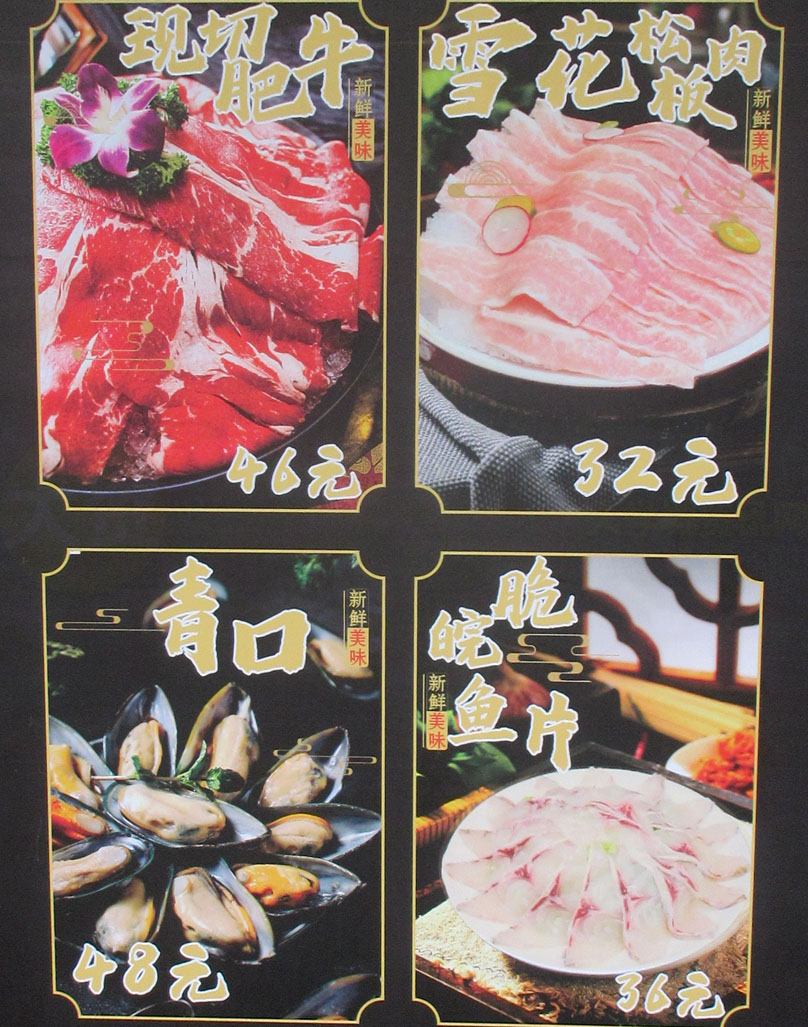 新天地二期西外列中 夏记椰子鸡 新鲜美味 现切肥牛46元,雪花松板肉32元,青口48元,脆皖鱼片36元