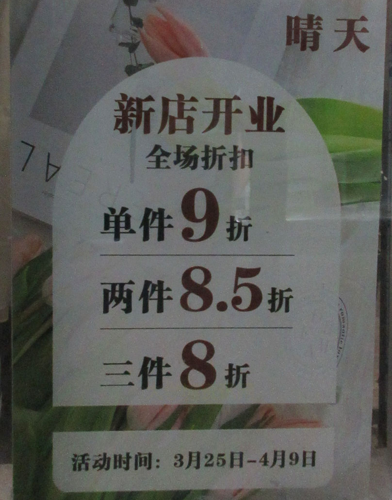 | 新天地一期二楼内西中廊道中段约 新开一家叫晴天的女装服饰店 开业期间3.25-4.9全场单件9折,两件8.5折,三件8折 | ||||||