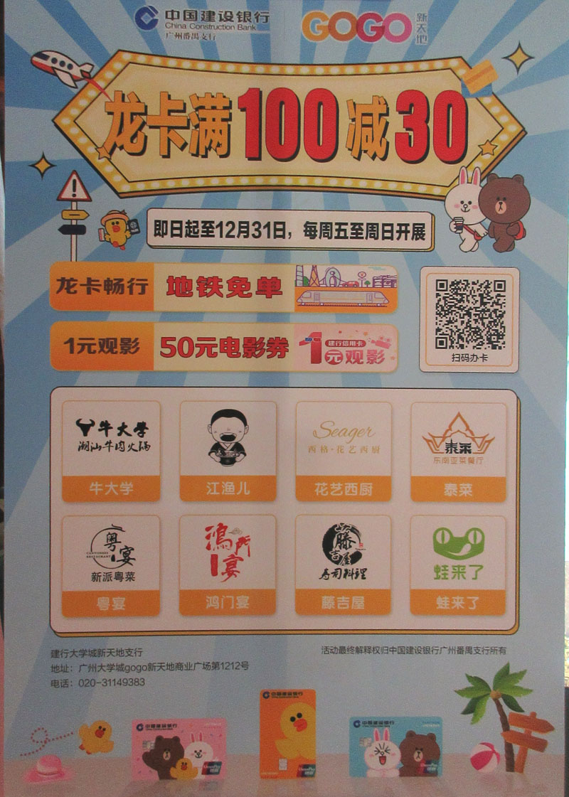 建行龙卡满100减30 即日起至12月31日,每周五至周日开展 地铁免单 1元观影 |