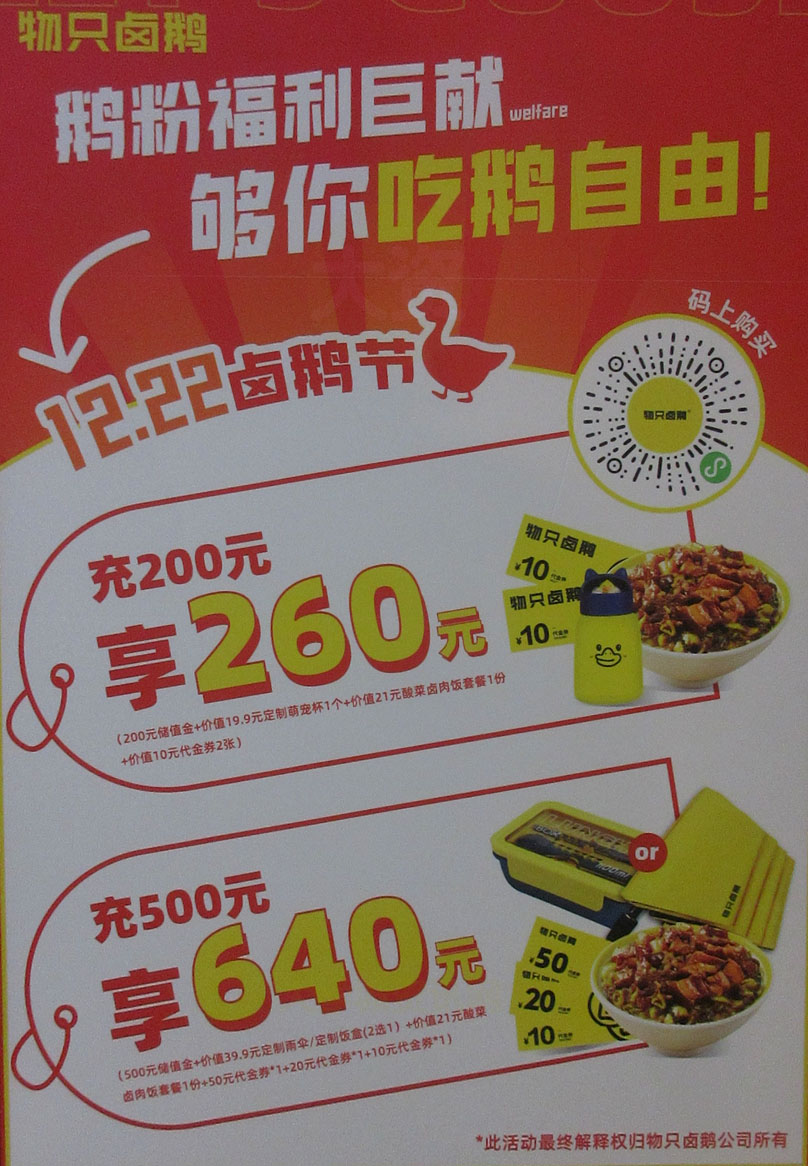 新天地三楼餐饮区南东内转角 蛙来了对面 物只卤鹅 鹅粉福利巨献 12.22卤鹅节 充200元享260元、充500元享640元