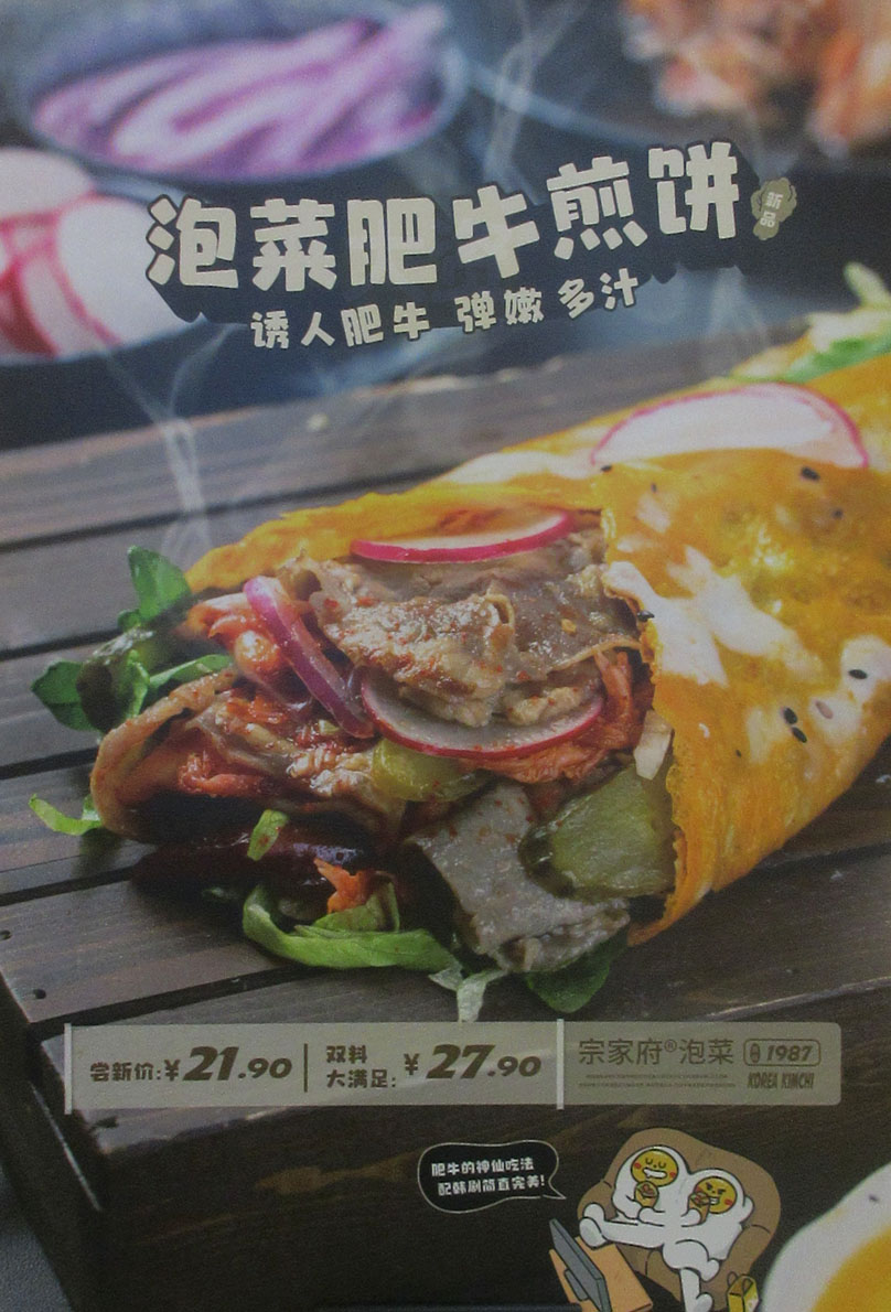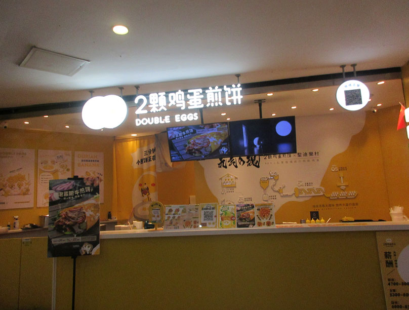 新天地三楼餐饮区南端 自动扶梯上西侧转角 2颗鸡蛋煎饼 新品-泡菜肥牛煎饼 尝新价21.9元、双料大满足27.9元