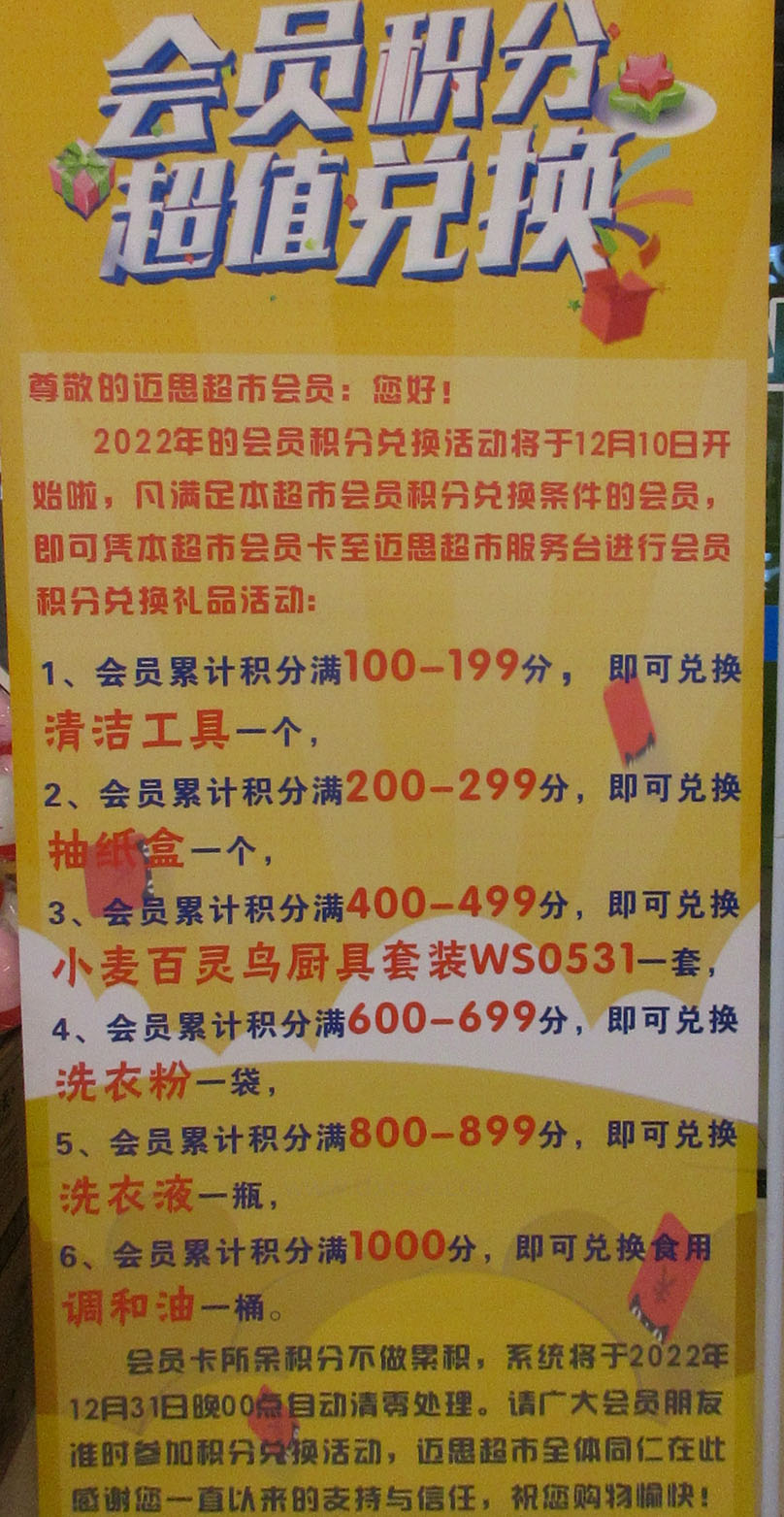 | 新天地二期一楼-迈斯超市 会员积分超值兑换提示 2022年迈思超市会员积分兑换活动将于12月10日开始,至12月31号结束,不兑换积分将清零 | ||||||
