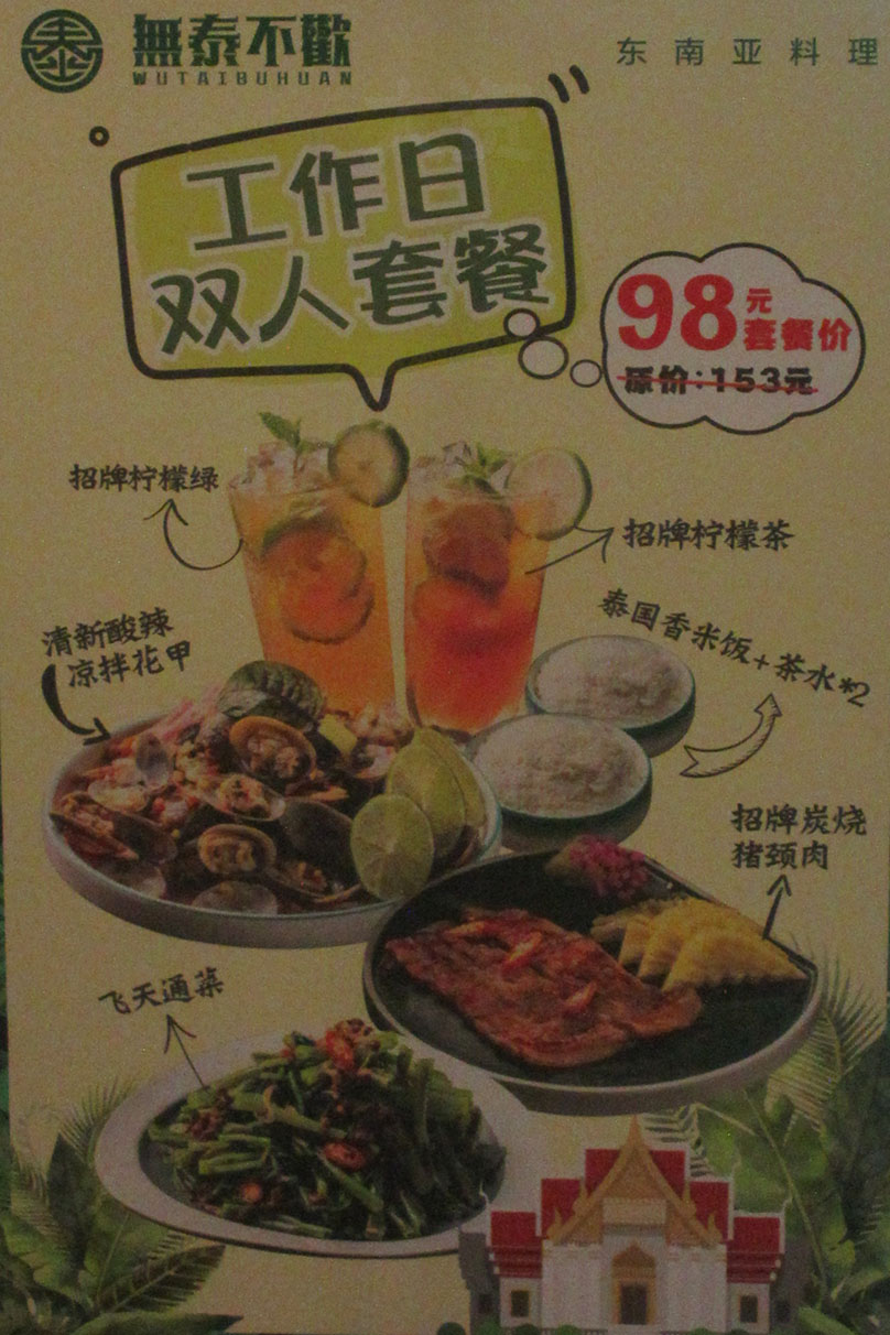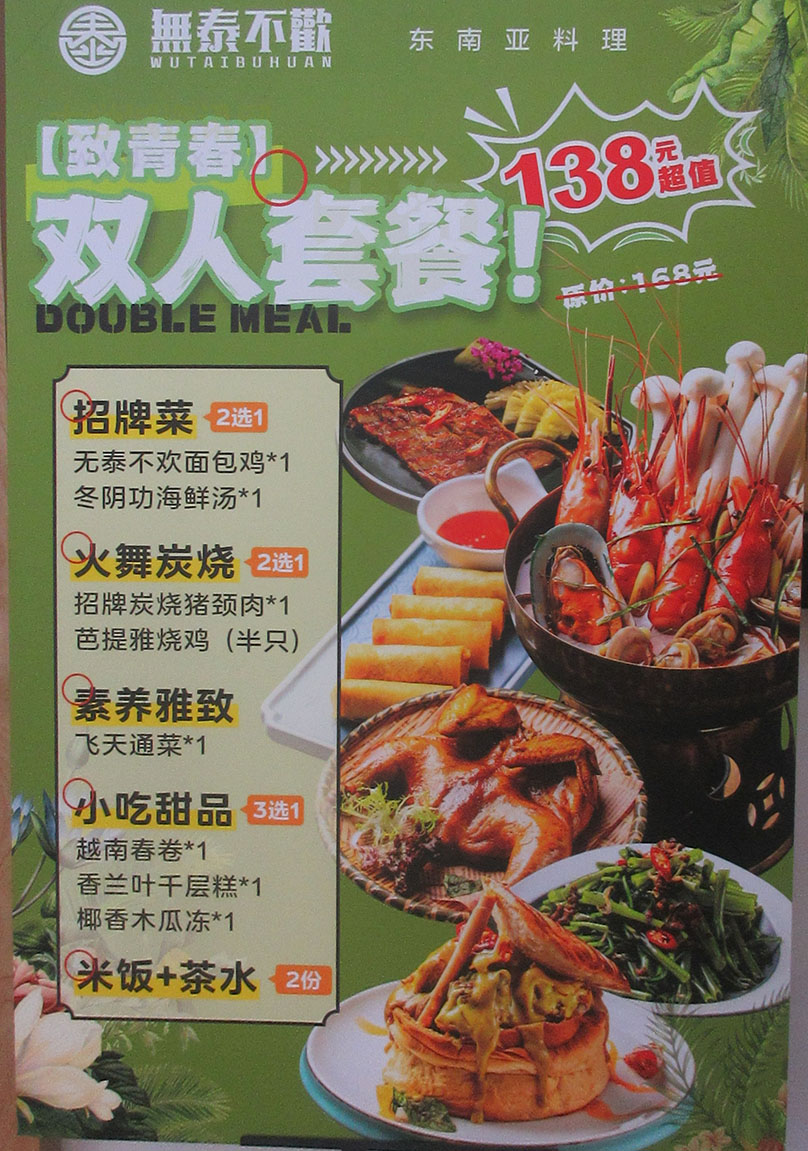 新天地二期二楼中&西外廊道 无泰不欢 多样双人套餐 3-4人套餐 价格配菜等览看