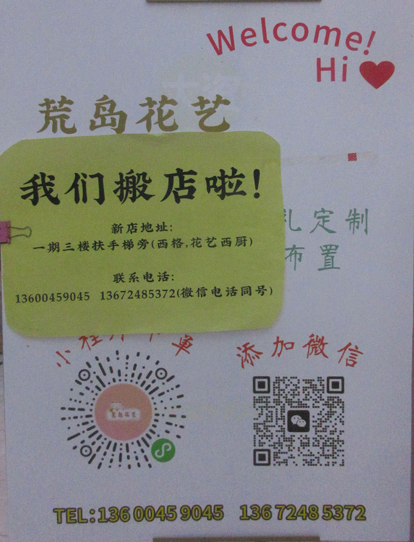 | 新天地二期二楼北扶梯西侧 荒岛花艺好像搬空没开了?贴示说是搬到一期三楼北的西格·花艺西厨 | ||||||