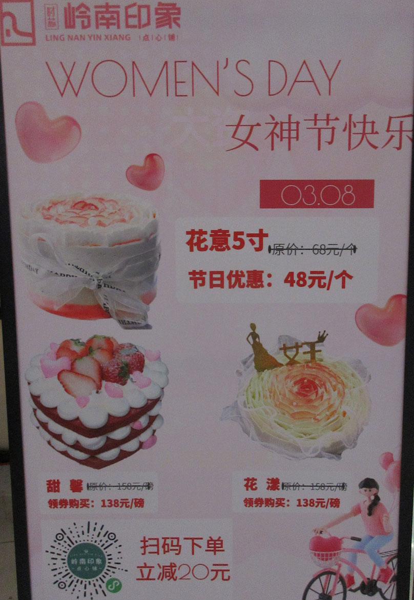 新天地二期北门 岭南印象蛋糕店 3.8女神节 花意5寸原价68元节日优惠48元1个 甜馨原价150元领券购买138元1磅 花漾原价150元领券购买138元1磅 扫码下单立减20元