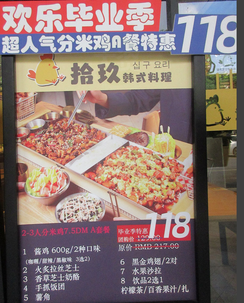 新天地二期西外列中 拾玖韩式料理 欢乐毕业季 超人气分米鸡A餐特惠118元 团购价129元 原价217元