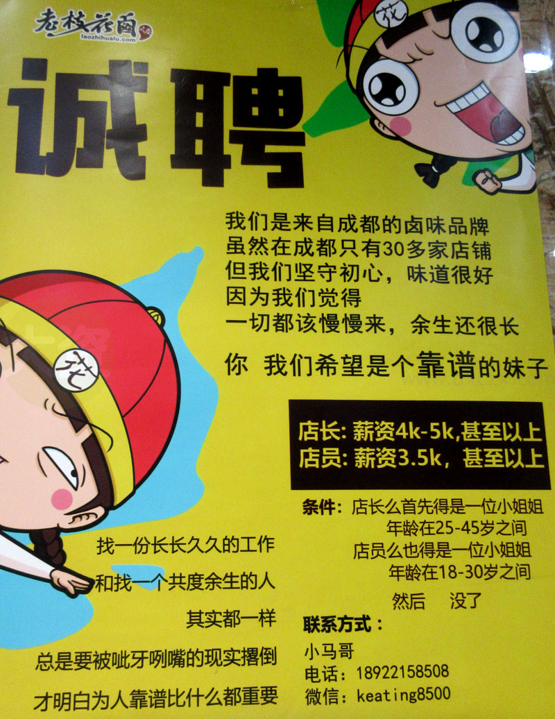 | 新天地二期一楼迈思超市南入口-老枝花卤店 招聘店长and店员 | ||||||