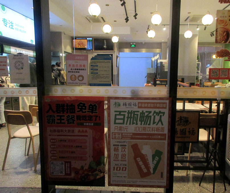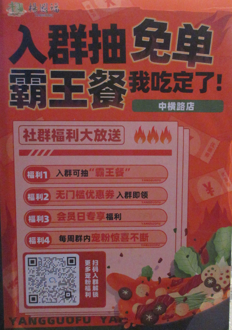 | 新天地二期新翼二楼西廊道北 杨国福麻辣烫 扫码入群抽免单 社群福利大放送:1入群可抽霸王餐 2无门槛优惠券入群即领 3会员日专享福利 4每周群内宠粉惊喜不断 | ||||||