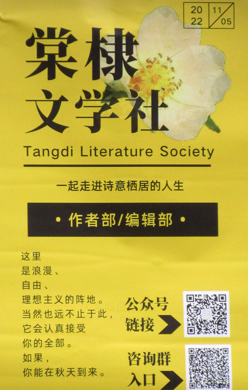 | 广大2022百团招新 摊位现场之棠棣文学社&春秋学社 具体位置榕轩3栋南侧辅道东端 | ||||||