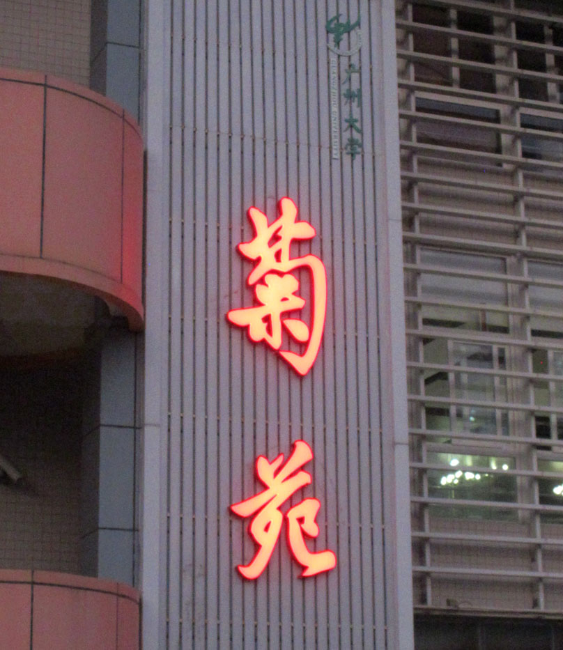 | 广大生活区菊苑餐厅饭堂楼前面之前的粤园两个字 现在看到已经换成了菊苑 | ||||||