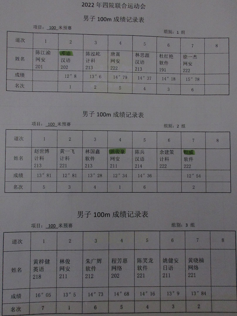 | 2022.10.22广大四院联合运动会 男子100米预赛(6个小组)成绩记录表 | ||||||